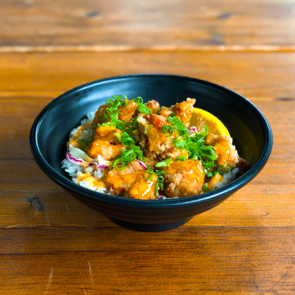 Boneless fried chicken thighs sprinkled with togarashi and drizzled with spicy mayo. Served on a bed of slaw.