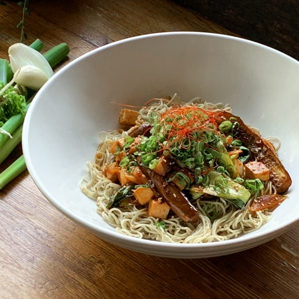 Tofu, eggplant, onions, sprinkled with togarashi, served with sauteed bok choy. Thin noodles.