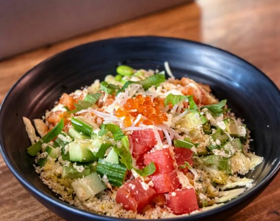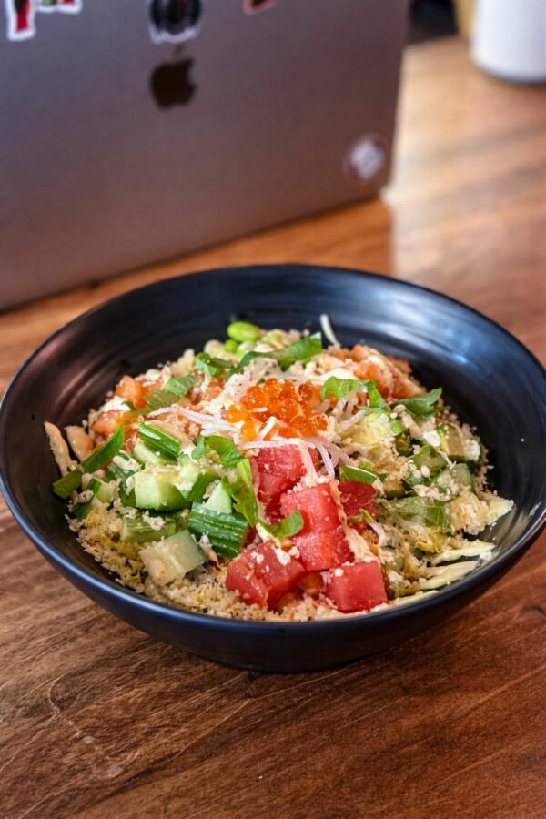 Cubed salmon and tuna sashimi, ikura (salmon roe), shrimp, edamame and diced cucumber over rice. Served with Yuzu mayo and zukke sauce.