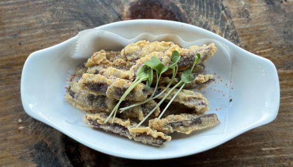 Fried purple yam fries ,soy sauce and sprinkle with wasabi powder.