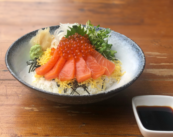 Salmon sashimi, ikura (salmon roe), shredded egg, nori, daikon sprouts and shiso lead. Served with zukke sauce.