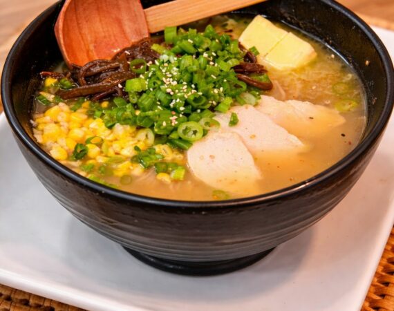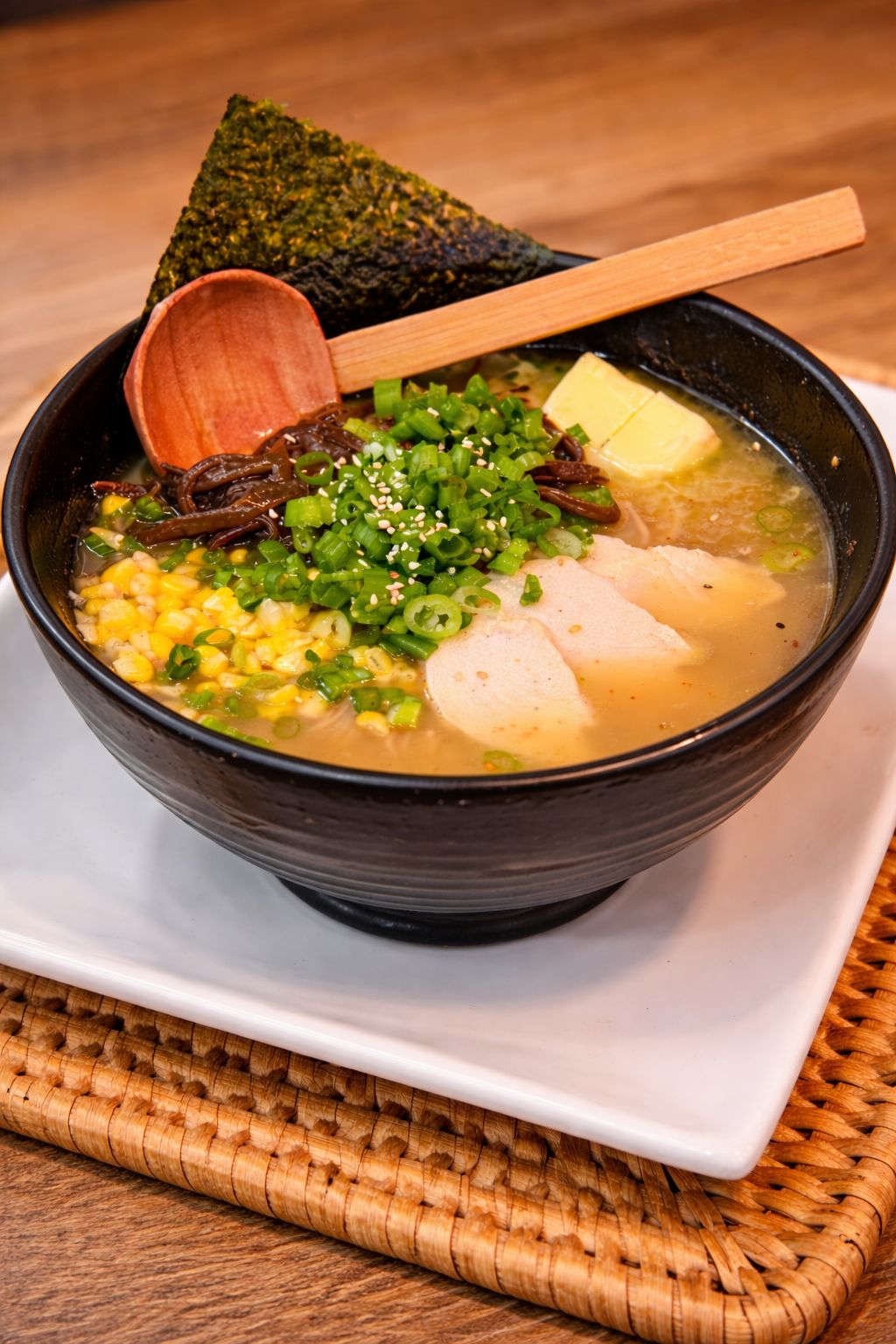 Light, salt-based chicken broth infused with yuzu kosho. Topped with yuzu marinated chicken breast, corn and kikurage mushrooms. Garnished, green scallions, nori and sesame seeds “yuzu peel comes in regular.” Thin noodles.