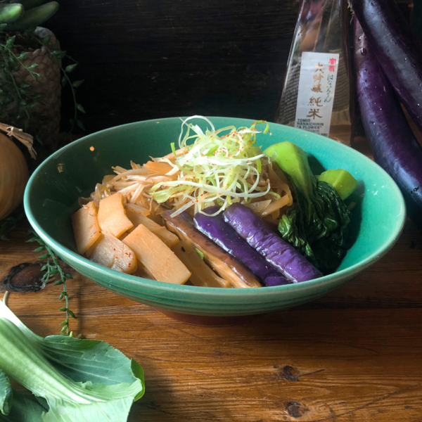 Eggplant, baby bok choy, sliced onions, bean sprouts, enoki mushrooms, bamboo shoots, shishito peppers, in a light soy sauce. Topped with white scallions and togarashi. Lightly spicy.